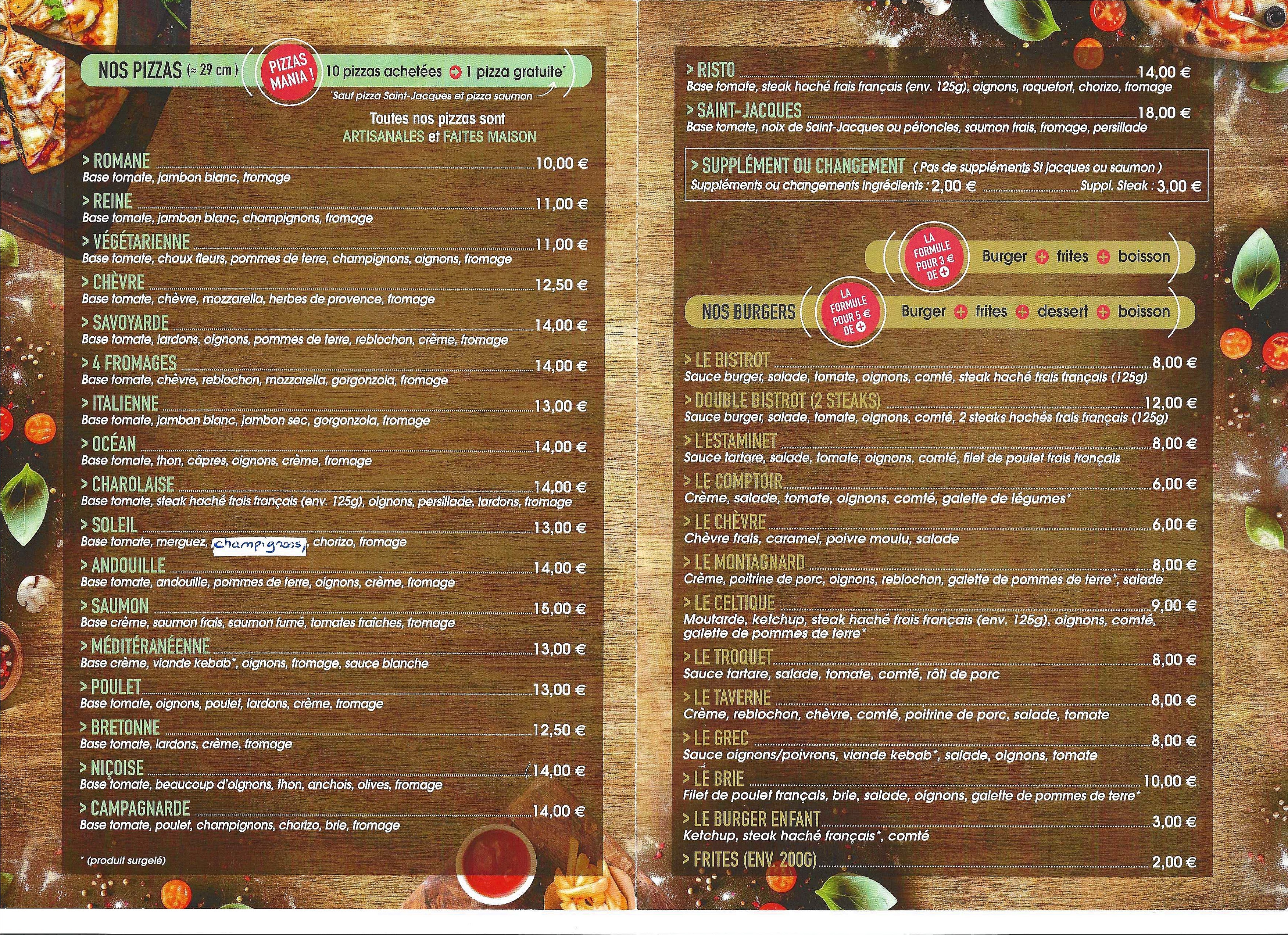 Burgers , pizzas, sandwichs, entrecôte, jarrets/frites, pavé de saumon, émincé de poulet et bien autres plats et desserts faits maison